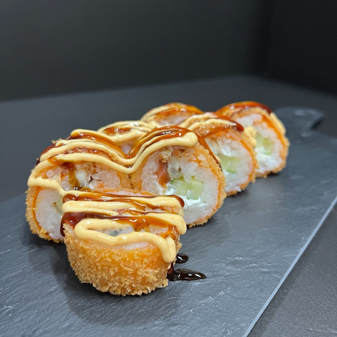 Новинка! Обжаренный ролл в маменори с лососем, угрем, творожным сыром и огурцом. Поливается соусом спайси и унаги.Маменори - это тонкие листы творога, изготовленные из сои. Маменори имеет нежную текстуру и слегка солоноватый вкус.