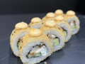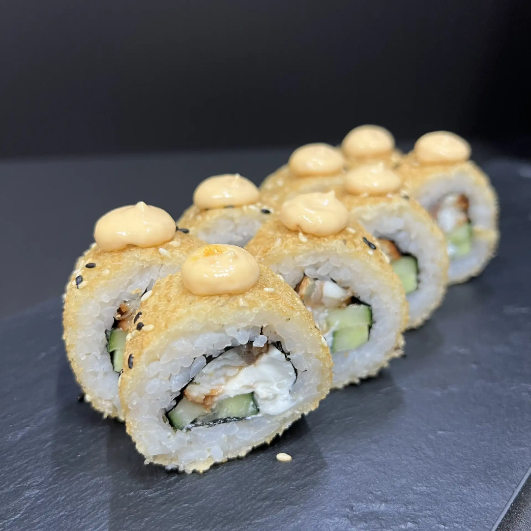 Ролл в темпуре с угрем, сливочным сыром и огурцом. Поливается соусом спайси.