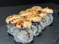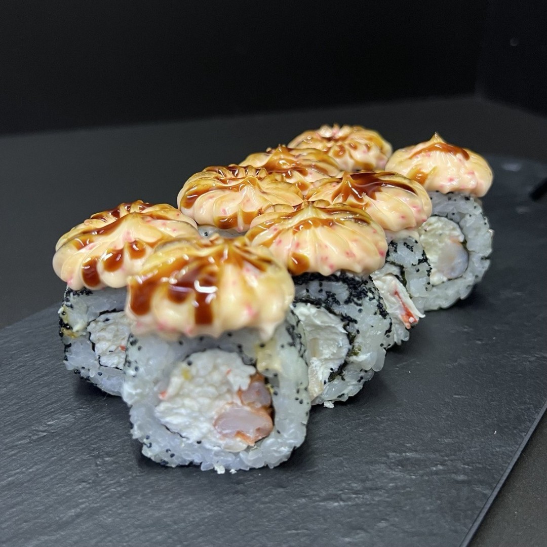 Новинка! Запеченный ролл с креветкой и снежным крабом, сливочный сыр. Сверху шапочка из яки соуса и соуса унаги.