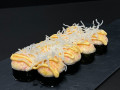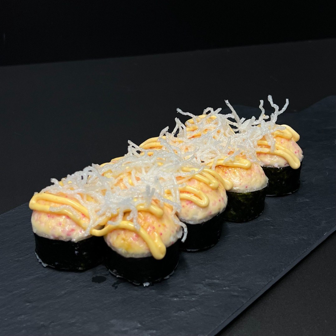 Новинка! Запеченный ролл с креветкой в темпуре, сливочным сыром и с нежной шапочкой. Сверху тонкая стружка.