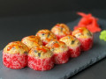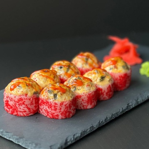 Запеченный ролл с шапочкой из угря и куриным филе, внутри с сливочным сыром и огурцом, в красной масаго и поливается острым соусом Шрирача.