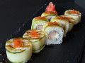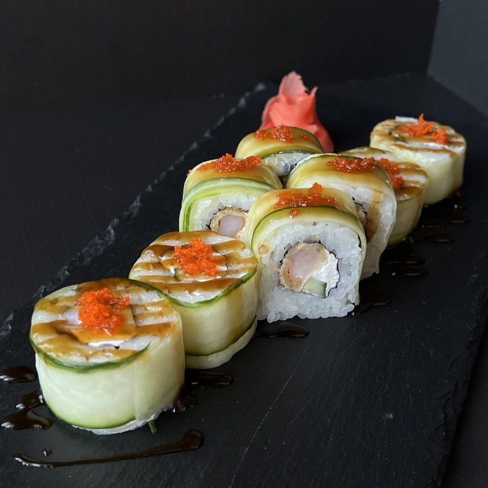 Новинка ролл с темпурной креветкой, сливочным сыром, огурцом наружу, оранжевой масаго и соусом унаги