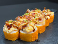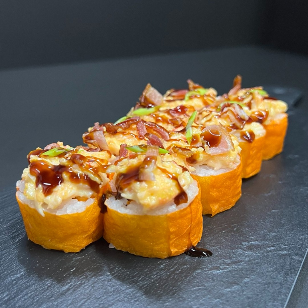 Новинка! Запеченный ролл в маменори с окунем в темпуре, творожным сыром и шапочкой из снежного краба и бекона. Поливается соусом унаги и зеленым луком.Маменори - это тонкие листы творога, изготовленные из сои. Маменори имеет нежную текстуру и слегка солоноватый вкус.